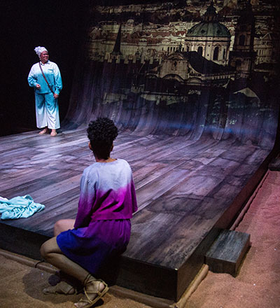 Knight said that the use of projections, which were designed by Yee Eun Nam, also helped with cutting and shortening the script. By showing elements visually that would usually be spoken, the projections help keep audience members engaged and interested. Lightning storms, enchanted forests, mystical silhouettes, Ariel casting spells, and even Miranda and Ferdinand playing chess are all projected onstage while the actors continue to tell the story traditionally.